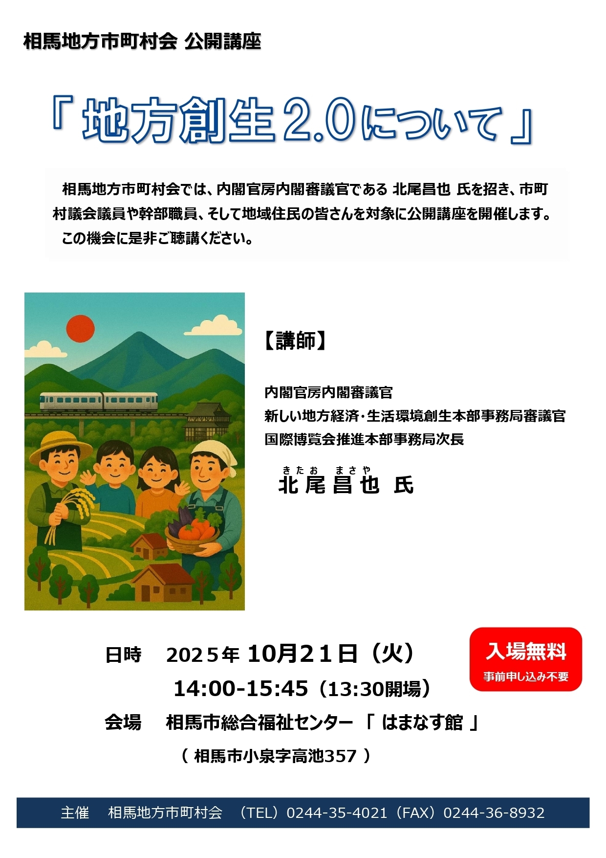 事務局トピックス 北尾昌也氏公開講座「地方創生2.0について」を開催します 相馬地方市町村会では、内閣官房内閣審議官である 北尾昌也 氏を招き、市町村議会議員や幹部職員、そして地域住民の皆さんを対象に公開講座を開催します。この機会に是非ご聴講ください。(事前申し込みは不要です。当日、会場にて受付ください) お問合せ 相馬地方市町村会 〒976-8601 福島県相馬市中村字北町63番地の3 相馬市役所3階 TEL:0244-35-4021