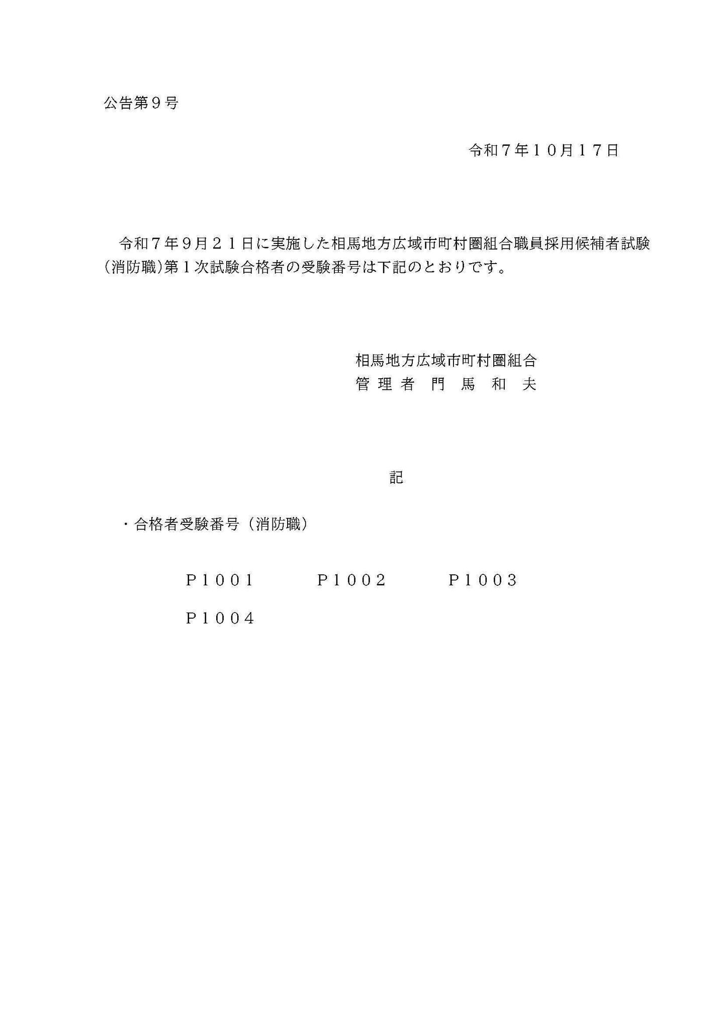 試験結果情報 【消防職】 相馬地方広域市町村圏組合職員採用候補者試験の結果は次のとおりです。(R7.10.17公告) (合格者には、公告日付で合格通知書を郵送しています) お問合せ 相馬地方広域市町村圏組合 〒976-8601 福島県相馬市中村字北町63番地の3 TEL0244-35-0211/FAX0244-36-8932