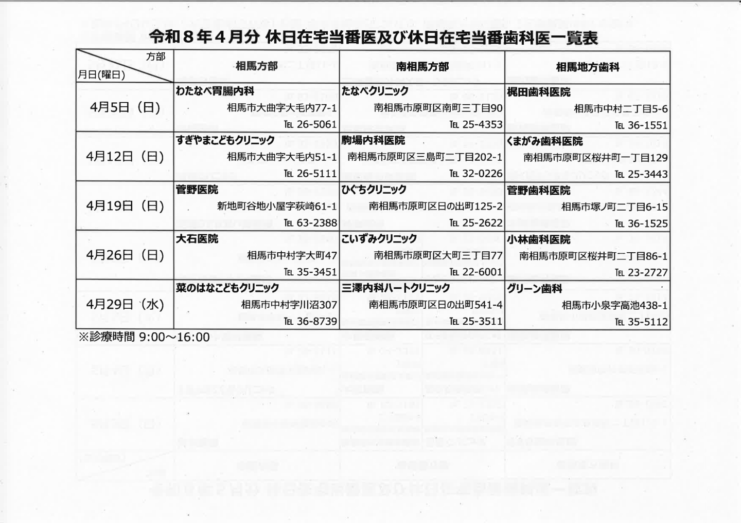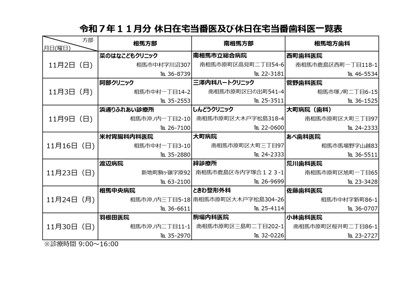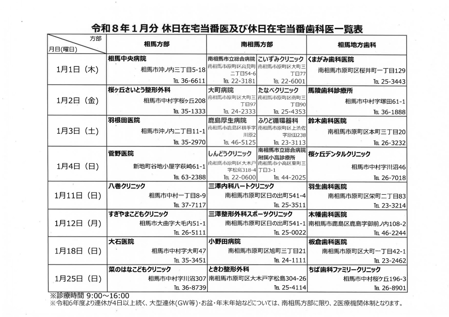 休日在宅当番医・休日在宅当番歯科医 相馬地方で、日曜祝日に診察を行っている医療機関を紹介します。※急遽変更となる場合がありますので、受診の際は、必ず事前に当該医療機関へ連絡してください。 お問合せ 相馬地方広域市町村圏組合 〒976-8601 福島県相馬市中村字北町63番地の3 TEL0244-35-0211/FAX0244-36-8932