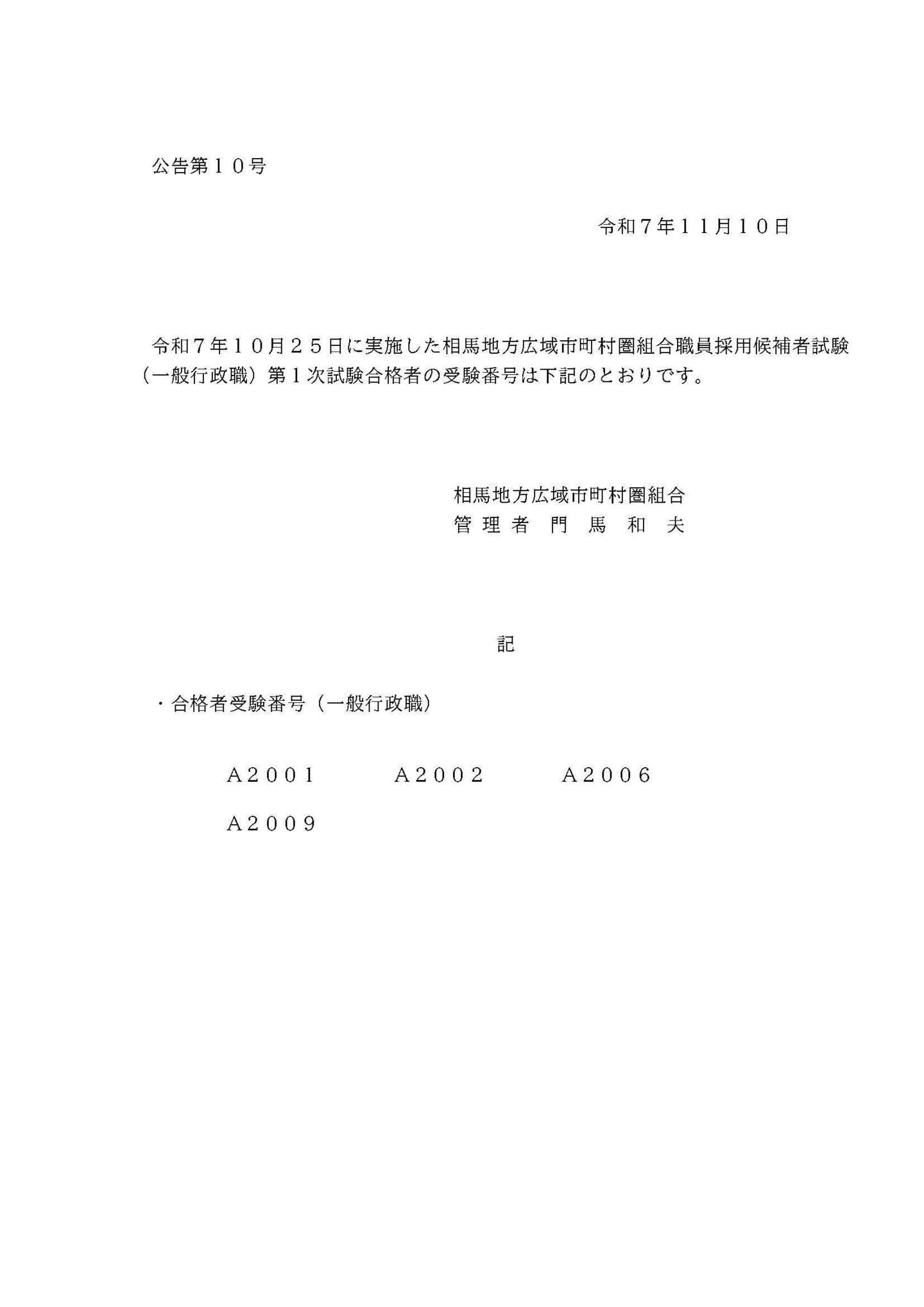 試験結果情報 【一般行政職(2次募集)】 相馬地方広域市町村圏組合職員採用候補者試験の結果は次のとおりです。(R7.11.10公告) (合格者には、公告日付で合格通知書を郵送しています) お問合せ 相馬地方広域市町村圏組合 〒976-8601 福島県相馬市中村字北町63番地の3 TEL0244-35-0211/FAX0244-36-8932