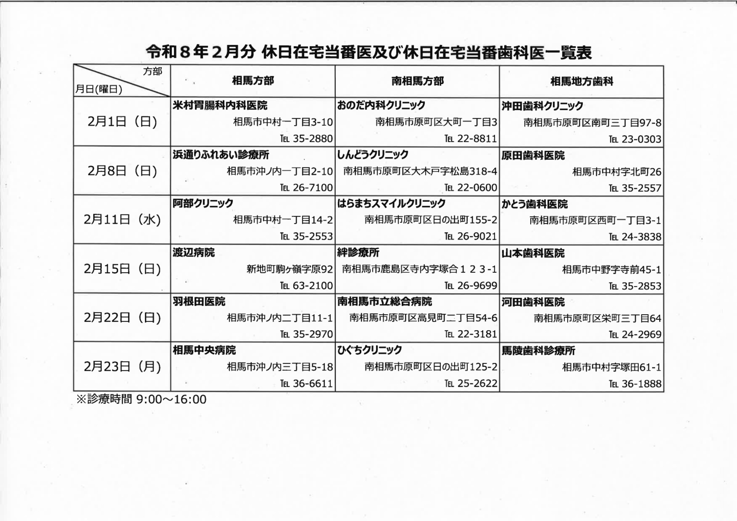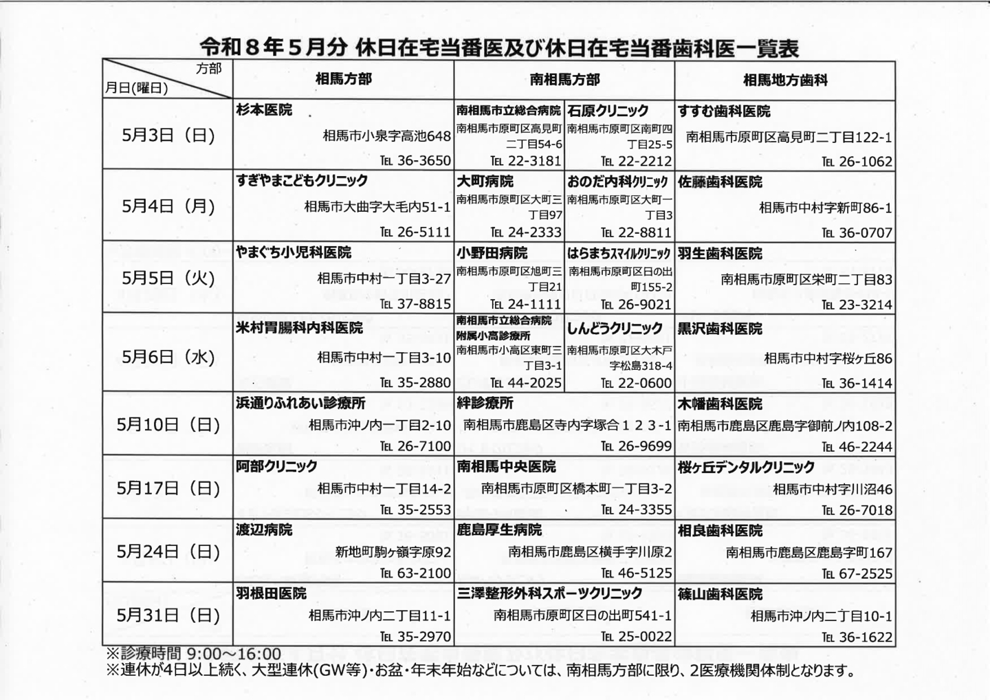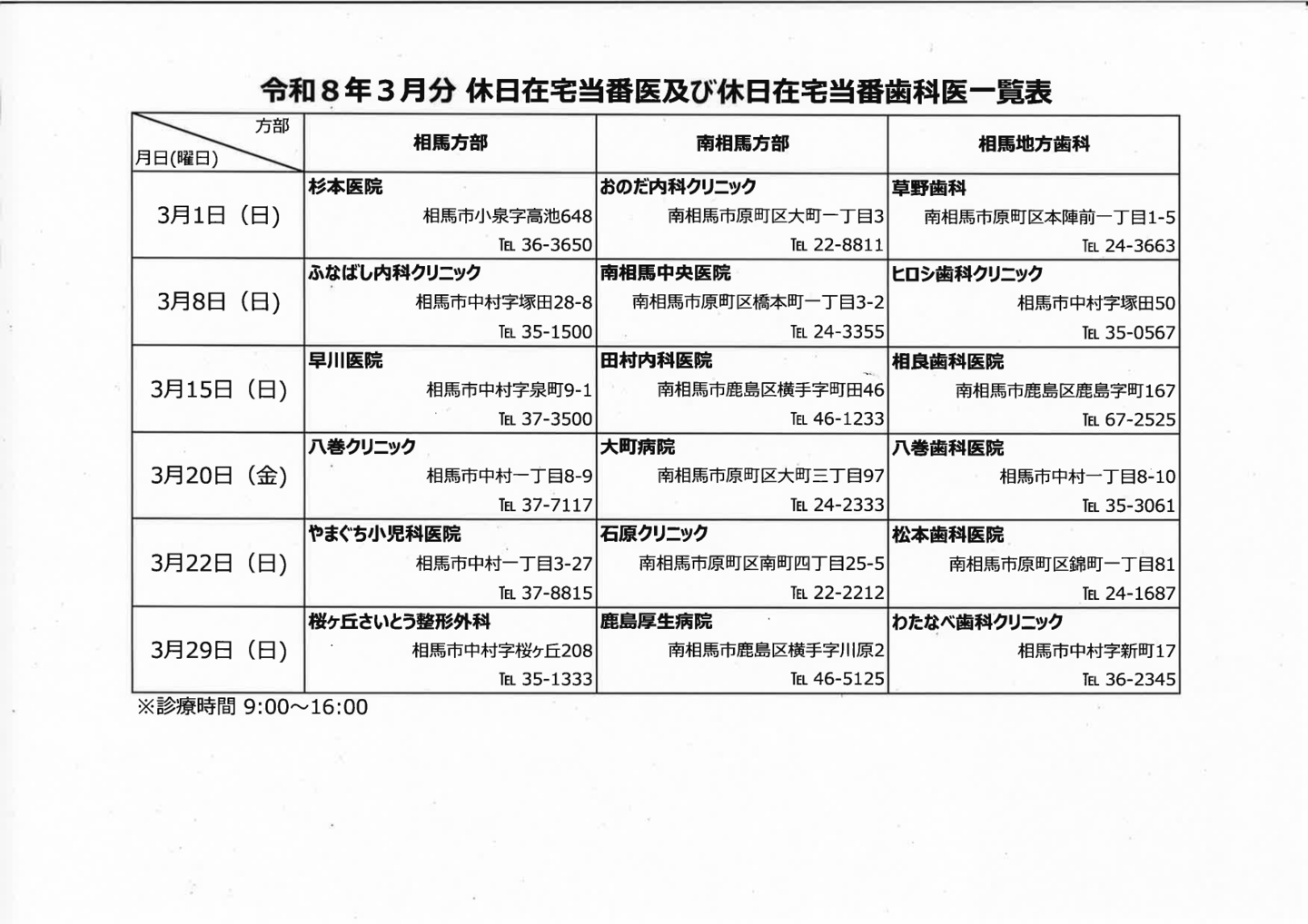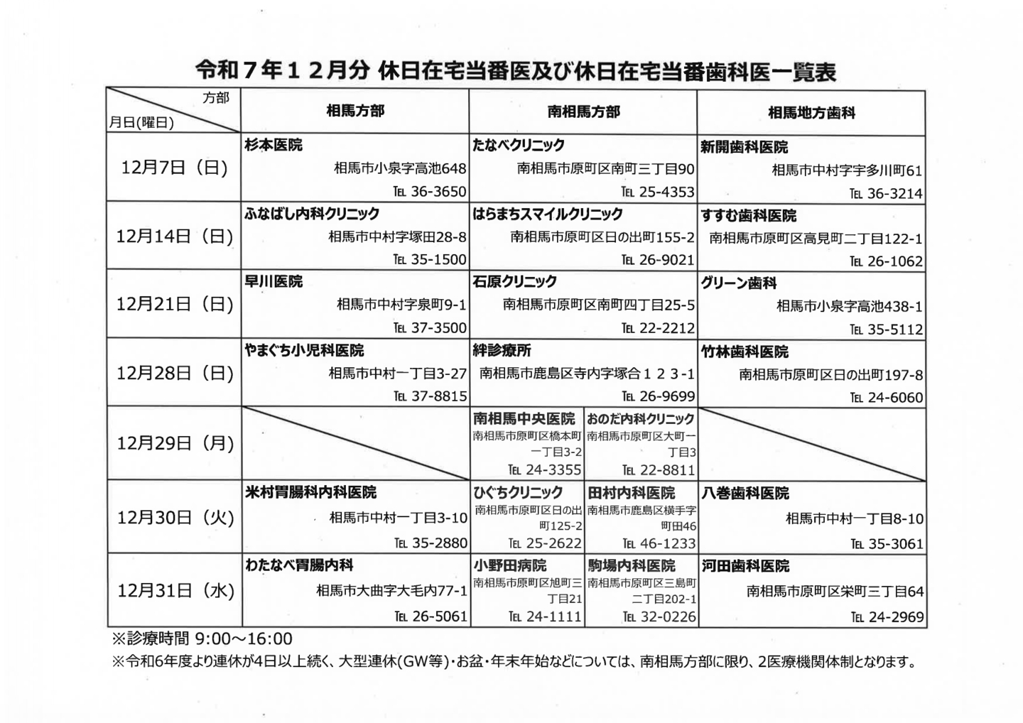 休日在宅当番医・休日在宅当番歯科医 相馬地方で、日曜祝日に診察を行っている医療機関を紹介します。※急遽変更となる場合がありますので、受診の際は、必ず事前に当該医療機関へ連絡してください。 お問合せ 相馬地方広域市町村圏組合 〒976-8601 福島県相馬市中村字北町63番地の3 TEL0244-35-0211/FAX0244-36-8932